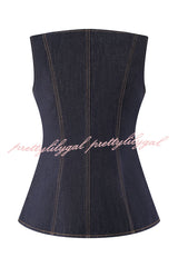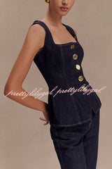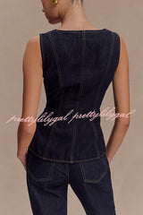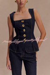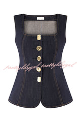- The sleeveless button-down denim top is a modern take on a classic silhouette, blending structure with effortless cool. This long silhouette has a sleek square neckline and sleeveless silhouette for a precise flattering fit. Front and back panels create a sculpted fit, while custom mismatched buttons add a playful, unique touch. The front button closure gives it a polished edge, making it the perfect piece to layer or wear alone.