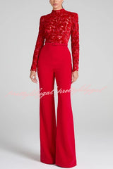 - ELEANOR jumpsuit is crafted from a sheer embroidered lace bodice, revealing just a hint of skin. The trouser is crafted from our signature crepe fabric and fully lined in satin for a smooth fit. The bodice features a high neckline, internal shoulder pads, and full-length sleeves with scallop detailing to the hem. Finished with a concealed zip down the centre back and a detachable red crepe belt.