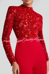 Eleanor Embroidered Floral Lace Long Sleeve Patchwork Belt Flare Jumpsuit