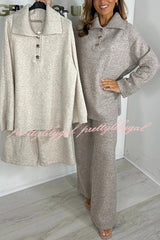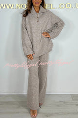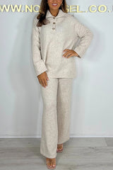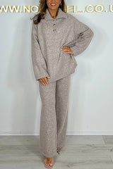 Solid Color Lapel Long-sleeved Loose Top and Elastic Waist Casual Pants Set