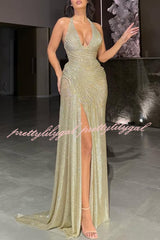 Edeita Sequin Pleated Design Deep Halter U-neck Slit Drape Gown Maxi Dress