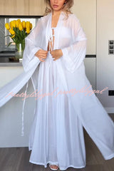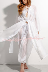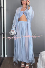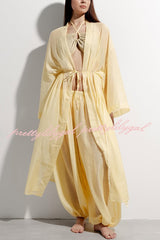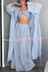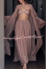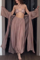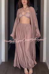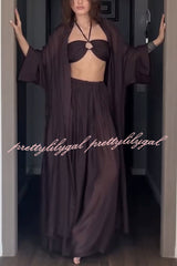 Flowy Linen Blend Halter Tank & Elastic Waist Tie-up Wide Leg Pants & Kimono Cover-Ups 3pieces Set