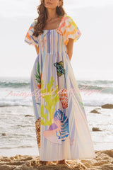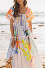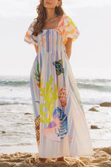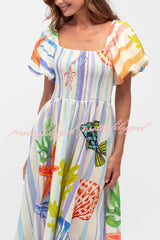 Marine Creature Print Square Neck Puff Sleeve Pleated Casual Pocket Maxi Dress