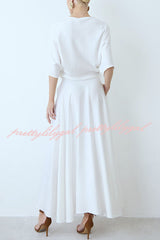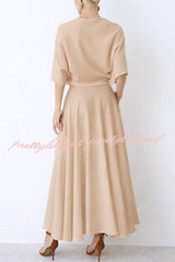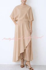 - This elegant and timeless flowing midi dress stands out with its stylish and timeless design. The wrap-style design exudes dynamism and sophistication. The loose fit, light and airy drape, and wrap skirt perfectly accentuate the figure, adding a touch of femininity. The high neck and wide sleeves balance the overall look, creating a modern and elegant style.Our distinctive clothing will add instant style to your wardrobe.