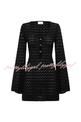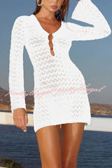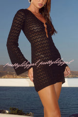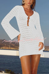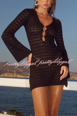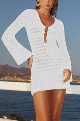 Solid Color Hollow-out V-neck Flared Long-sleeved Slim-fit Knitted Cover-up Mini Dress
