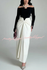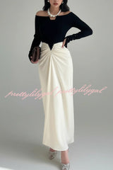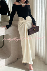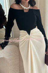 Stylish Pearl-embellished Elegant Off-shoulder Long-sleeved Draped Maxi Dress