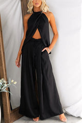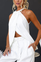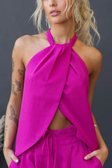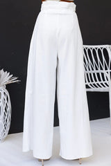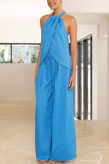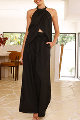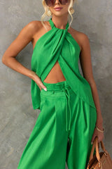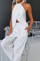 Gette Linen Blend Slit Front Top and High Rise Knoted Pocket Wide Leg Pants Set