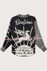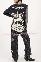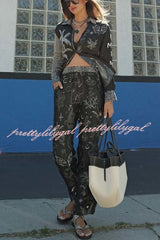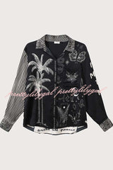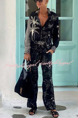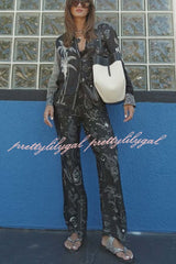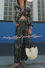 Black Magic Satin Unique Print Long Sleeve Blouse and Elastic Waist Pocket Wide Leg Pants Set