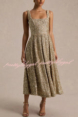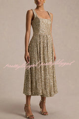 - Crafted from our premium sequin, in a rich gold hue, this show-stopping midi catches the light with every gesture. Designed with a square neckline and delicate shoulder straps for a flattering, structured fit. While the pleated skirt adds movement and drama for a chic, party-ready silhouette. Perfect for nights where glamour is non-negotiable.Our distinctive clothing will add instant style to your wardrobe .