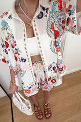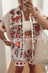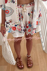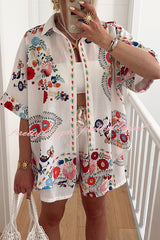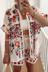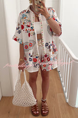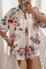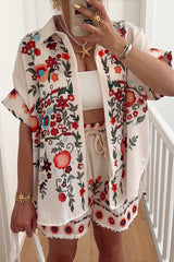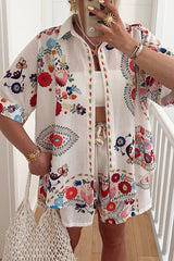Linen Blend Floral Print Short Sleeve Loose Shirt and Elastic Waist Tie Casual Shorts Set