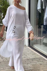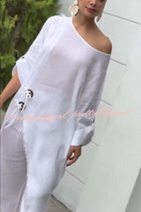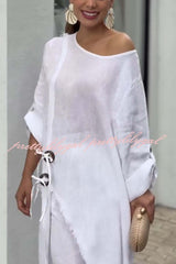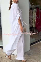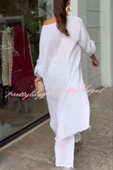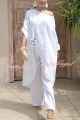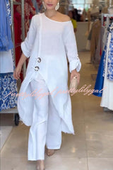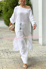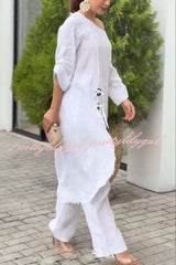 Tehla Linen Blend Ring Tie-up Detail Midi Blouse and Elastic Waist Pocketed Loose Pants Set