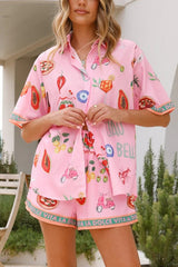 Linen Blend Unique Printed Short-sleeved Loose Shirt and Elastic Waist Drawstring Shorts Set