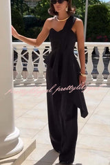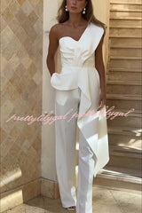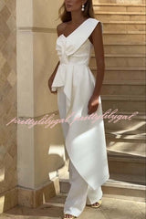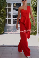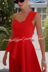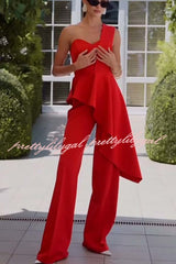 Amena One Shoulder Sweetheart Neck Ruffle Hem Top and Elastic Waist Pocket Wide Leg Pants Set