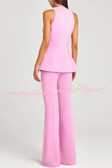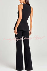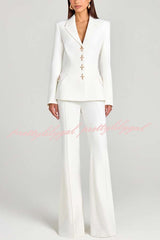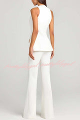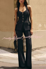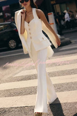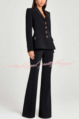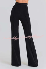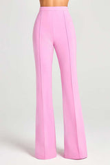 - Slim-fit trousers in exclusive crepe with contrasting satin waistband, silhouette-enhancing seams on the front, side slits and pockets on the back.