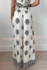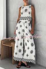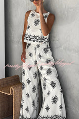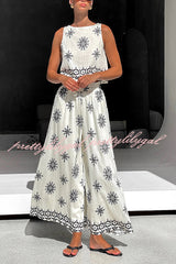 Unique Printed Round Neck Sleeveless Button Top and Elastic Waist Pocket Wide Leg Pants Set