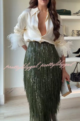 Party Crasher Feather Trim Long Sleeve Button Up Loose Blouse