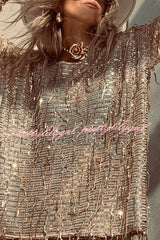 Fashion Sequin Round Neck Long Sleeve Tassel Top and Elastic Waist Casual Shorts Set