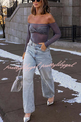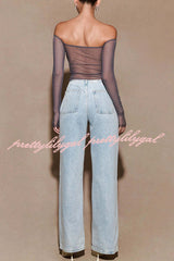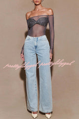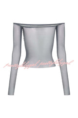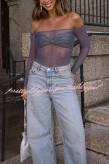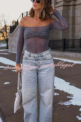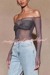 - Designed with a bardot neckline and long sleeves, this top showcases an alluring off-shoulder style that highlights your collarbone. The mesh fabrication gives it a modern, sultry look, while the diamante-encrusted bust adds a touch of sparkle and luxury. A twist front detail enhances its unique style, making this top perfect for elevating your evening look with effortless sophistication.