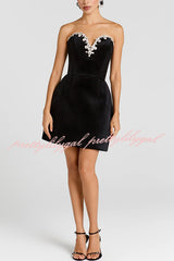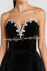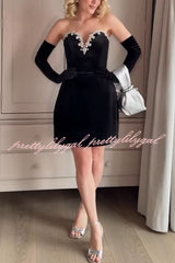 - This INES black dress is crafted from our exclusive velvet fabric and features a strapless sweetheart neckline with a V-neck detail at the front for added dimension. Luxurious jewel-tear trim accentuates the collarbone, while a boning bodice with boning at the front and back creates a slender waistline. Tulip-shaped mini skirts feature side pockets for easy movement. A concealed zipper at the back ensures a comfortable and snug fit.Our distinctive clothing will add instant style to your wardrobe .