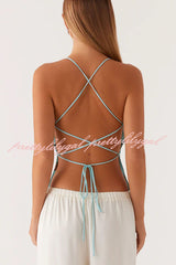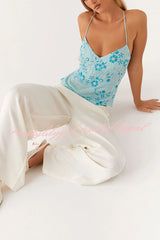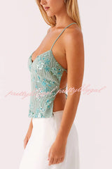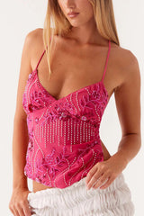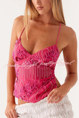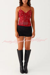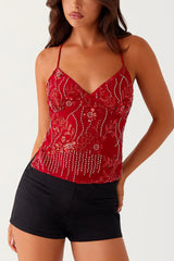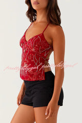 - Sequin Cami Top features a front V-neckline, dazzling beaded material, and an open back. This piece brings effortless glamour to any night, perfect for catching the light on the dance floor.Our distinctive clothing will add instant style to your wardrobe.