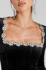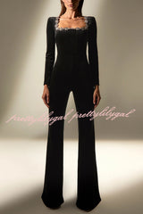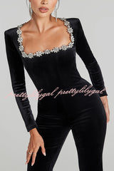 - This sophisticated design is tailor-made for endless celebrations. This luxurious black velvet jumpsuit features a square neckline, bold bejeweled trim, padded shoulders and an internal bodice bone at the bodice for shape and support. It features flared pants and a zipper at the back for a stylish look.