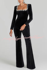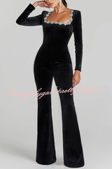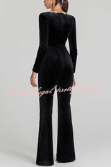 Classic Charm Velvet Jewel Embellished Trim Long Sleeve Flare Jumpsuit
