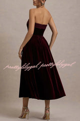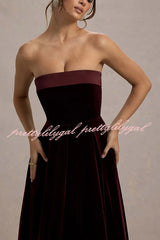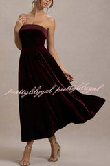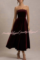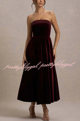 - Known for its rich texture and timeless elegance, this strapless midi dress is a sophisticated choice for your next special occasion. Wrapped in premium port velvet, the fitted silhouette flatters your silhouette. Subtle satin details add a touch of sophistication and enhance the overall look. Minimal accessories and classic heels exude effortless elegance and style, perfect for an evening party or formal dinner.