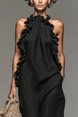Linen Blend Halter Neck Ruffle Sleeveless Casual Loose Maxi Dress