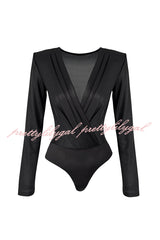 Chic Celebration Glossy Fabric Pleated V-neck Long Sleeve Stretch Bodysuit