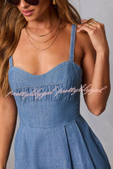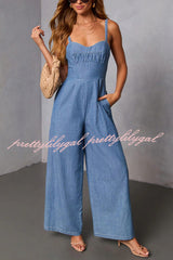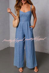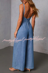 Solid Color Sleeveless Backless Casual Pocket Faux Denim Wide-leg Jumpsuit