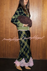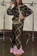 Holiday plaid Satin Unique Print Patchwork Lace Stretch Waist Draped Maxi Skirt