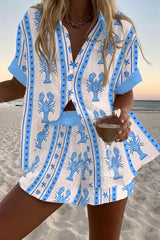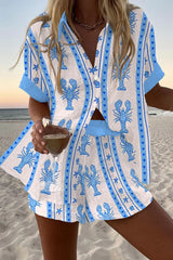 Blue Lobster Print Loose Button Elastic Waist Shorts Set