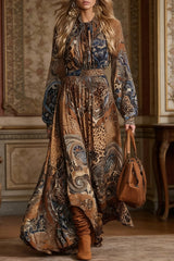 Bohemian Style Unique Printed Long-sleeved Fitted Waist Vacation Maxi Dress