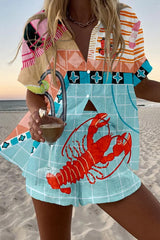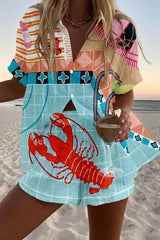 Checkered Lobster Print Loose Button Elastic Waist Shorts Set
