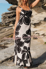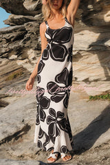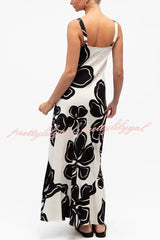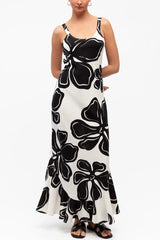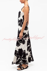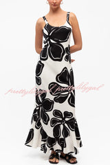 Color-blocked Floral Print Sleeveless Slim-fit Elegant Ruffled Hem Maxi Dress