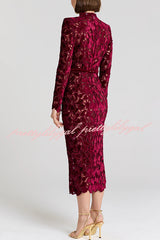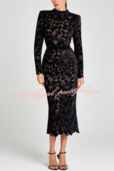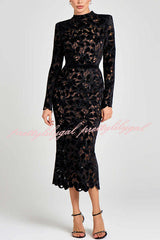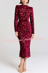 Diane Velvet Embroidered Floral Lace Long Sleeve Belt Scallop Edge Midi Dress