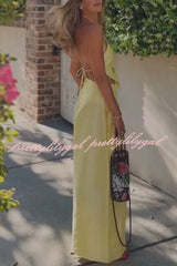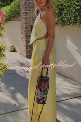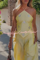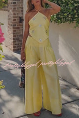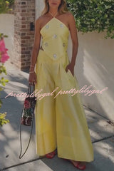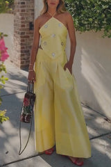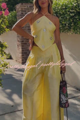 Jamie Satin Sparkling Flowers Halter Backless Tank and High Rise Pocket Wide Leg Pants Set