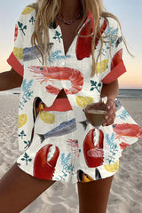 Lemon Fish and Shrimp Print Loose Button Elastic Waist Shorts Set