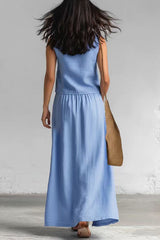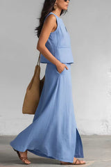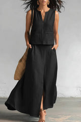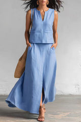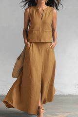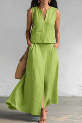 Linen Blend Loose V-neck Sleeveless Top and Elastic Waist Casual Pocket Midi Skirt Set