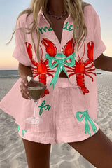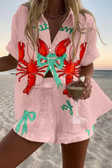 Lobster Bow Print Loose Button Elastic Waist Shorts Set