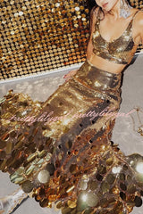 Party Sequin Button Crop Tank and Irregular Round Sequin Tassels Hem Maxi Skirt Set