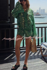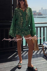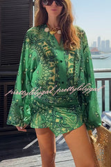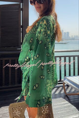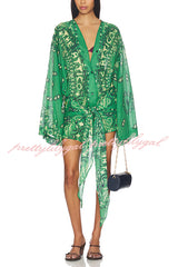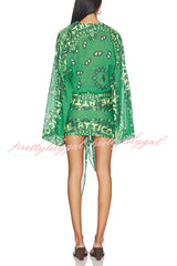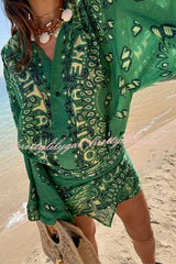 Sulena Linen Blend Ethnic Print Button Up Long Bell Sleeve Warp Tie-up Mini Dress