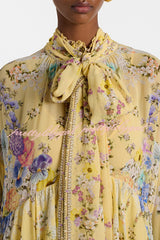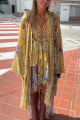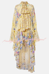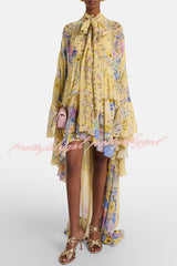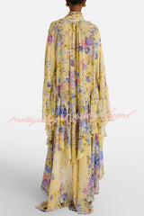 Tisla Chiffon Floral Knotted Neck Bell Sleeve Layered Ruffle High Low Maxi Dress