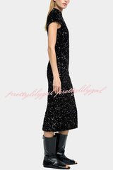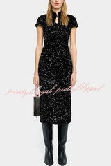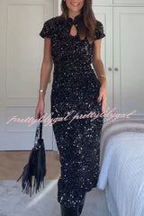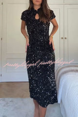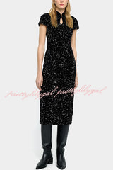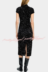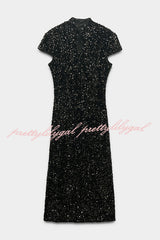 Cheongsam Style Velvet Sequin Stand Neck Short Sleeve Slit Midi Dress