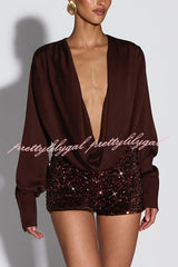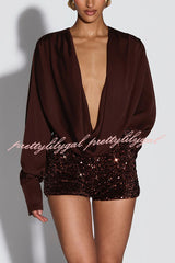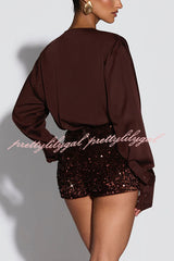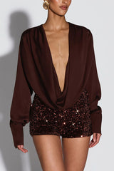 Girls Night Satin Drape Cowl Neck Shirt and Velvet Sequin Elastic Waist Shorts Set
