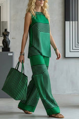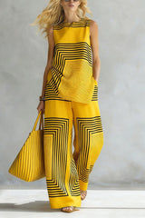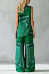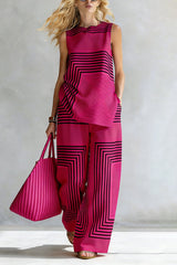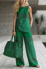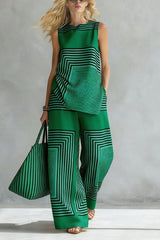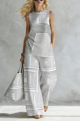 Geometric Print Loose-fitting Round Neck Sleeveless Top and Elastic Waist Casual Pocket Wide-leg Pants Set