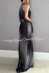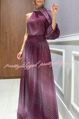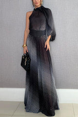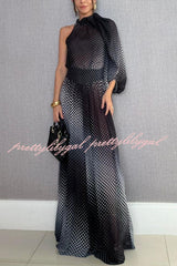 Gradient Polka Dot Print High-Neck Asymmetrical Balloon Sleeve Top and High Rise Wide Leg Pants Set