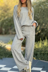 Solid Color Long-sleeved Crew Neck Top and Elastic Waist Pocket Casual Pants Set