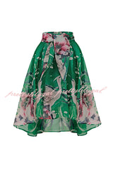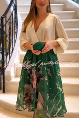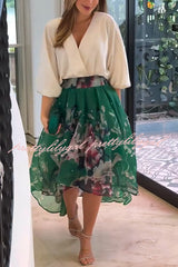 Tessy Batwing Sleeve Top and Floral Elastic Waist Pearls Detail High Low Midi Skirt Set