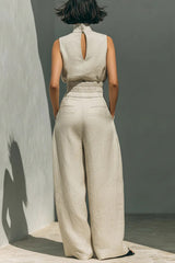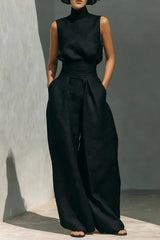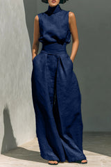 Linen Blend Solid Color Turtleneck Sleeveless Top and Casual High-waisted Elastic Waist Pocket Wide-leg Pants Set